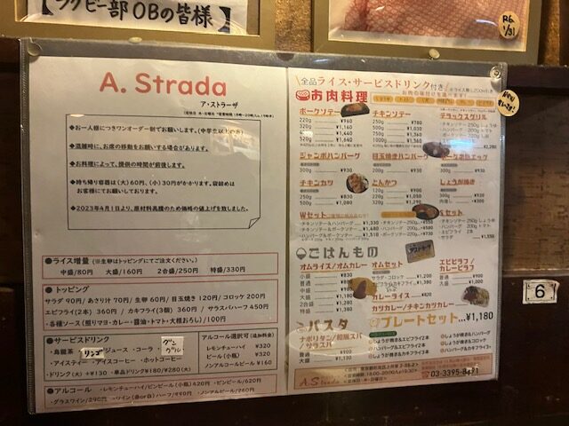 メニューに書かれているアストラーザーはA・STRADAと書かれている。A・STRADAはイタリア語で